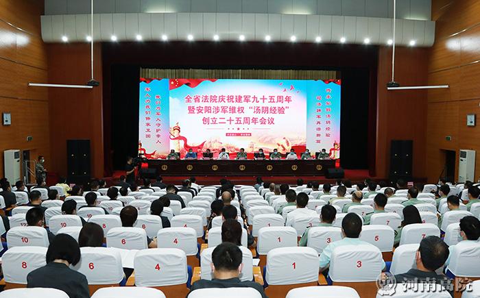 为深入学习贯彻习近平强军思想和习近平法治思想,研讨交流新时代涉军维权工作创新发展的思路举措,全力服务国防和军队现代化建设,8月9日,全省法院庆祝建军九十五周年暨涉军维权“汤阴经验”创立二十五周年会议在安阳中院召开。省委常委、省军区少将政治委员徐元鸿,省法院党组书记、院长胡道才出席会议并讲话。
