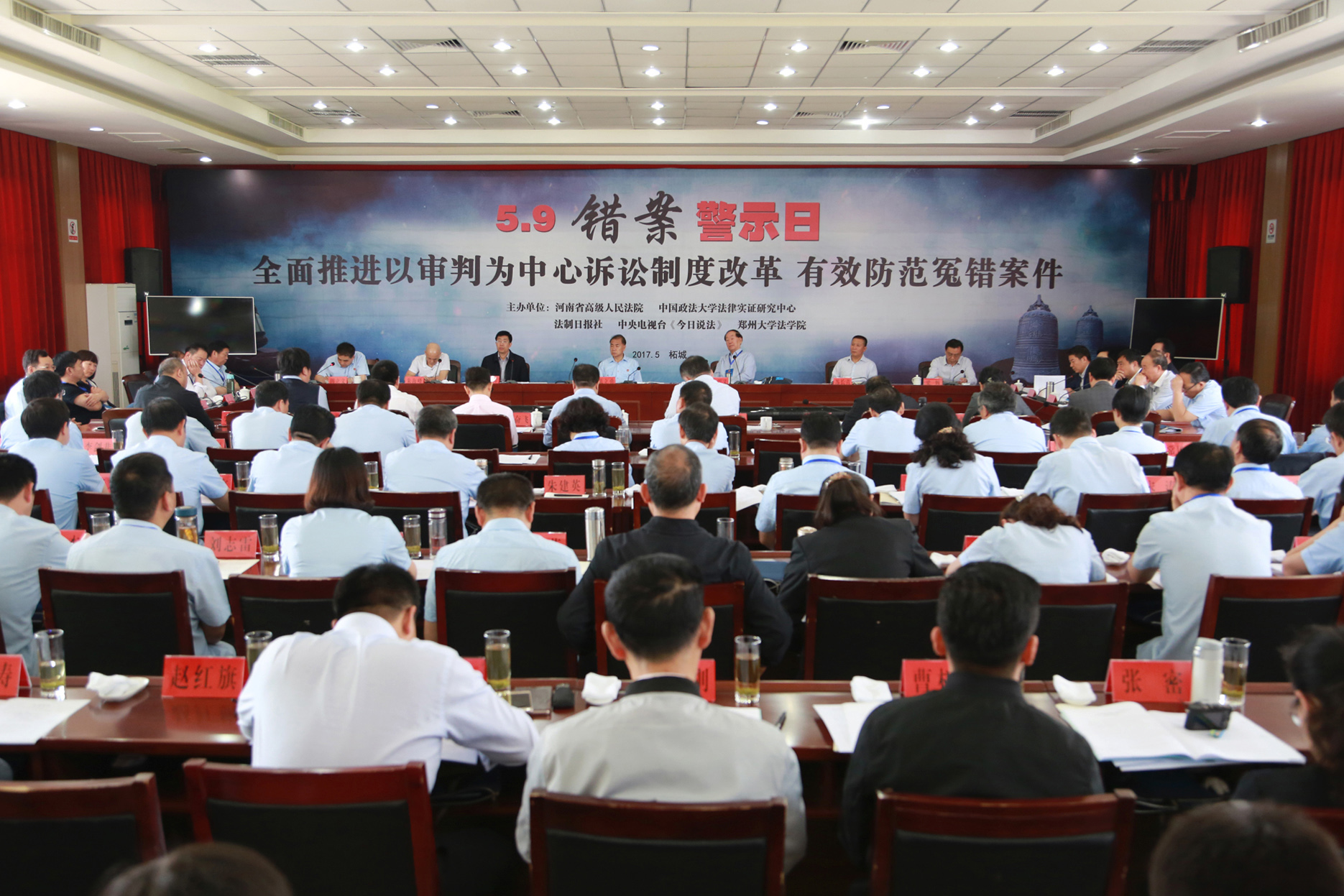 5月9日上午,河南省高级人民法院与中国政法大学法律实证研究中心、法制日报社、中央电视台《今日说法》栏目、郑州大学法学院在柘城县联合举办以“全面推进以审判为中心诉讼制度改革,有效防范冤错案件”为主题的2017年“5·9错案警示日”座谈会,这是省法院连续第七年举办该项活动。河南高院党组书记、院长张立勇出席并讲话。商丘市委副书记苏长青致欢迎辞。柘城县委书记梁辉应邀出席会议。