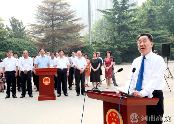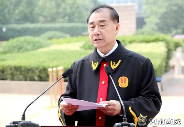 河南高院党组副书记、副院长刘晓云宣读了河南高院186名入额法官名单。面对鲜艳的五星红旗和宪法,河南高院党组书记、院长张立勇身着法袍,庄严走向宣誓台,左手抚按宪法,右手举拳,宣读誓词。全体入额法官整齐列队,站在领誓人身后,举起右拳,面向国旗,跟诵誓词。