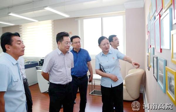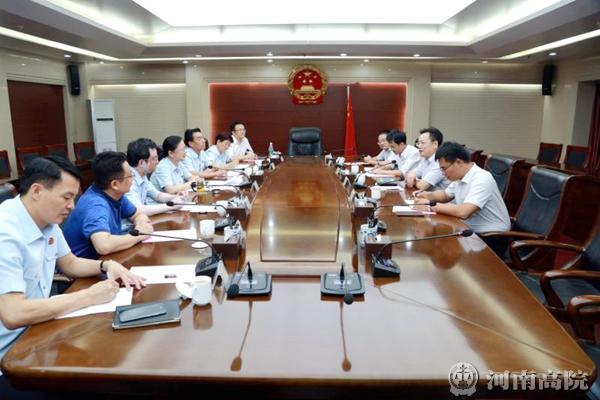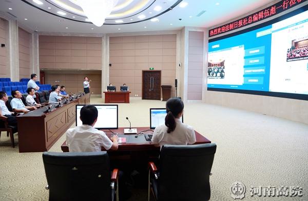 8月24日下午,法制日报社总编辑伍彪一行4人来到河南省高级人民法院进行调研。河南高院党组成员、副院长宋海萍等陪同。 伍彪一行首先参观了河南高院的新媒体工作室和信息集控中心。并就法制日报改版后共同关心和关注的问题与河南省高级人民法院、郑州市中级人民法院和郑州市金水区人民法院的有关同志进行了沟通和交流。 伍彪在讲话中对河南法院近几年来在各项工作所取得的成绩给予充分的肯定和高度评价,并认真听取了大家对法制日报改版工作中应注意问题的意见建议。 受张立勇院长的委托,宋海萍在主持座谈会时代表张立勇院长和院党组,对法制日报社一直以来对河南法院工作给予的高度关注和大力支持表示感谢!并表示要在法制日报社的大力支持下,把法院各项工作做的更好。