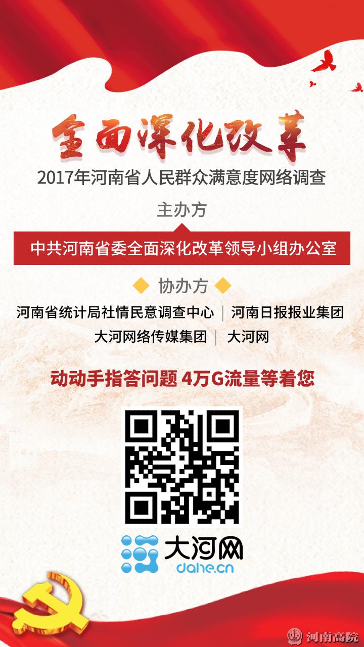 改革开放近40年,您对河南省全面深化改革满意吗,您对全面深化改革有什么建议都可以提了。12月21日,“河南省全面深化改革人民群众满意度调查”活动专栏(ggb.dahe.cn)正式上线,动动手指答问题,40000G流量等着您。 党的十八大以来,河南省委坚持把全面深化改革作为重大政治责任,坚持和完善“一跟进、两聚焦”的总体思路,有力有序有效推进改革。五年来,中央部署的改革任务在河南得到不折不扣贯彻落实,省级出台各类改革方案551件,承担国家级改革试点116项,重要领域和关键环节改革取得突破性进展,形成了一批改革亮点,有些改革走在全国前列,全面深化改革呈现全面发力、多点突破、纵深推进的良好态势。 为深入学习贯彻党的十九大精神,客观了解各项改革举措落地见效,人民群众获得感的情况,坚定不移将改革推向深入,以实际行动迎接改革开放40周年。中共河南省委全面深化改革领导小组办公室联合大河网、河南省统计局社情民意调查中心开展“2017年河南省全面深化改革人民群众满意度第三方评估”网络问卷调查活动。 本次调查活动通过互联网广泛征集人民群众的意见建议,内容涉及今年以来全省各省辖市、省直管县(市)及各省直单位改革工作成效和人民群众获得感情况。题目形式为单项及多项选择题,网民可根据问卷提示一步步参与填写,在线填写完毕后,留下手机号码,系统将自动提交您的问卷。活动为期一个月,欢迎广大网友登录“河南省全面深化改革人民群众满意度调查”活动专栏(ggb.dahe.cn)或扫描文末二维码参与问卷调查,此次活动将提供40000G的手机流量奖励,凡参与活动的网友均有机会获得1G的手机流量。 省委改革办将对征集的意见建议进行汇总整理,进一步改进和提升我省改革工作水平,给人民群众带来实实在在的获得感。
