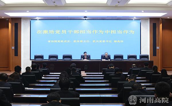 陈兆法主任强调,要强化责任意识,从“新时代司法事业发展的需要、加强法院队伍建设的需要、建设模范机关的需要”的高度,充分认识激励干部担当作为的重要意义,进一步提高政治站位,认清自身职责,切实增强责任感、使命感和紧迫感。要把握正确导向,突出新时期好干部标准,把“忠诚、干净、担当”“想干事、能干事、干成事”“信得过、靠得住、能放心”等要求贯彻落实到干部队伍建设各领域各方面各环节,持续开展“争做李庆军式好法官”活动,引导、激励广大干警在关键吃劲岗位勇于担当、做出成绩。要做到担当作为,各部门要分工负责、相互协作、形成合力、一体推进,通过思想教育激励、能力培养激励、典型引路激励、提拔晋级激励、考核奖惩激励、容错澄清激励、关心关爱激励、警示监督激励等措施,积极营造争先创优、务实重干、担当作为的干事氛围。要提升能力水平,切实加强自身建设,着力打造一支政治过硬、精干内行、公平公正、勤奋务实、清风正气的党建政工队伍,为激励党员干部担当作为提供有力保障。