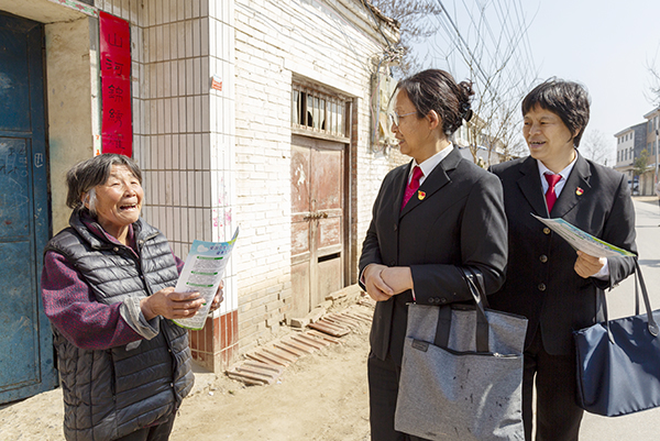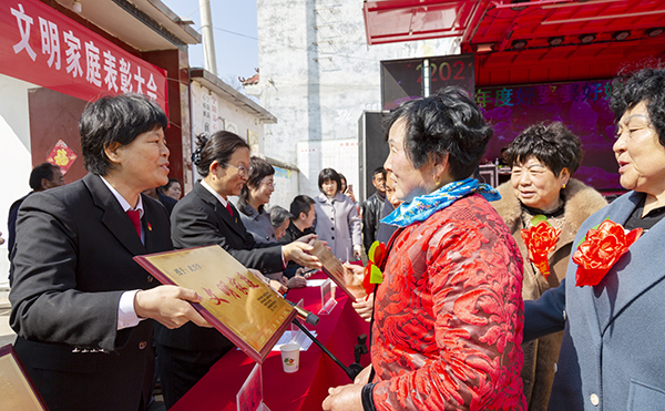 3月4日上午,阳光明媚,春风和畅,省法院一行10余人在二级巡视员于雪梅和执行局局长、河南省女法官协会秘书长石文灵的带领下,来到省法院精神文明定点扶贫村——商丘市宁陵县石桥镇前赵村,和村党支部联合开展“好婆婆”、“好媳妇”、“文明家庭”表彰和“学雷锋”志愿服务等精神文明帮扶活动。前赵村党群服务中心门前人头攒动,一片喜气洋洋的热闹景象。