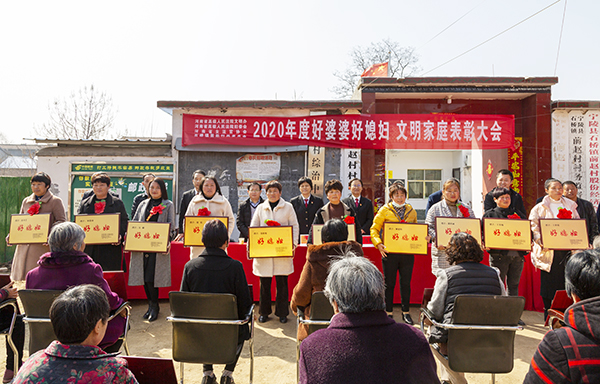 为进一步推进乡村家风社风建设,省法院和前赵村党支部联合举办了“好婆婆”、“好媳妇”和“文明家庭”评选活动。经前赵村各村民组认真组织推荐,省法院文明办、妇委会、河南省女法官协会、前赵村党支部共同研究,在广泛征求意见的基础上,经严格审核,推选出了10位“好婆婆”、10位“好媳妇”和5户“文明家庭”。表彰会上,25名被评选出的先进代表胸带大红花,高高兴兴的走上主席台领取了奖牌和奖品。在场群众掌声不断,会场气氛欢快热烈。通过此次表彰活动进一步弘扬家庭传统美德,倡导文明和谐家风,有力推动了文明乡风建设,取得了良好效果。