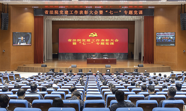 会议由省法院党组副书记、常务副院长郭保振主持。省法院班子成员,在党50年老党员代表,离退休党员代表,机关和直属单位党员干警700余人参加会议并聆听授课。