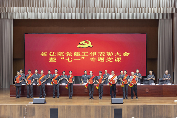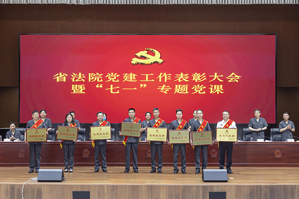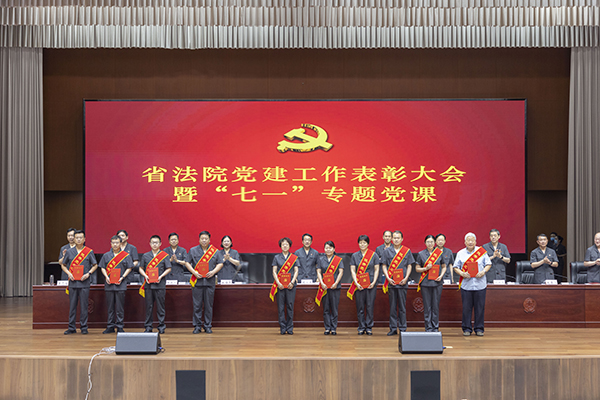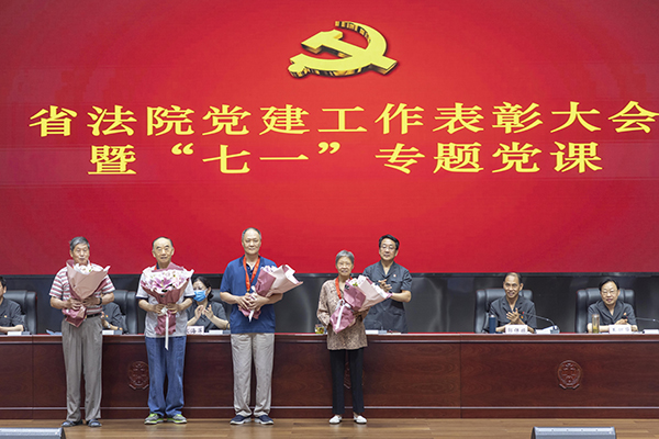 省法院院领导为“光荣在党50年”离退休老党员代表颁发了纪念章,为2021年度先进党支部、优秀党务工作者、优秀共产党员颁发了荣誉证书,并号召机关各基层党组织和广大党员干警向先进榜样学习,进一步坚定理想信念,践行根本宗旨,发扬优良作风,强化使命担当,把对党忠诚融入到每一项司法活动中,体现到办好每一起案件上。