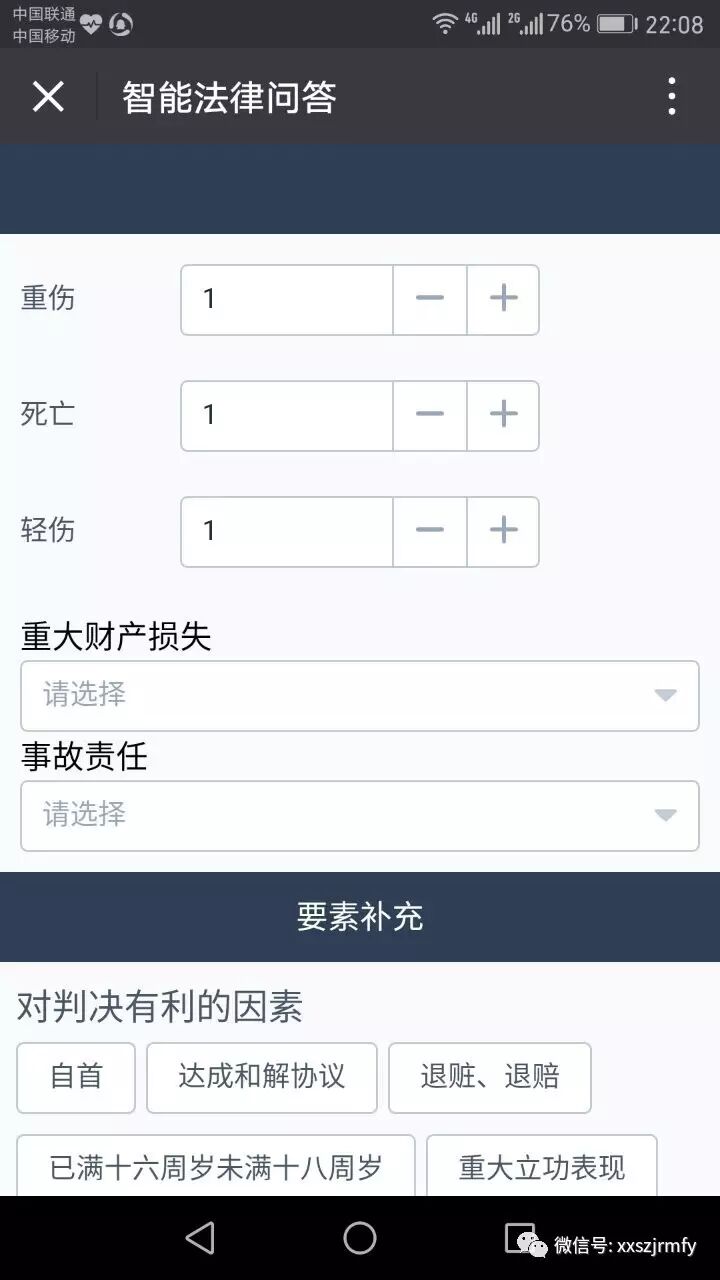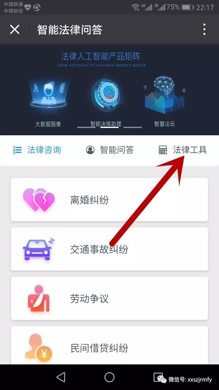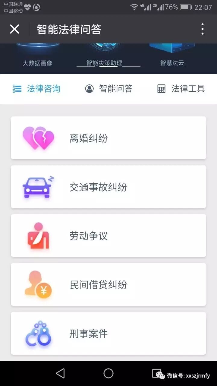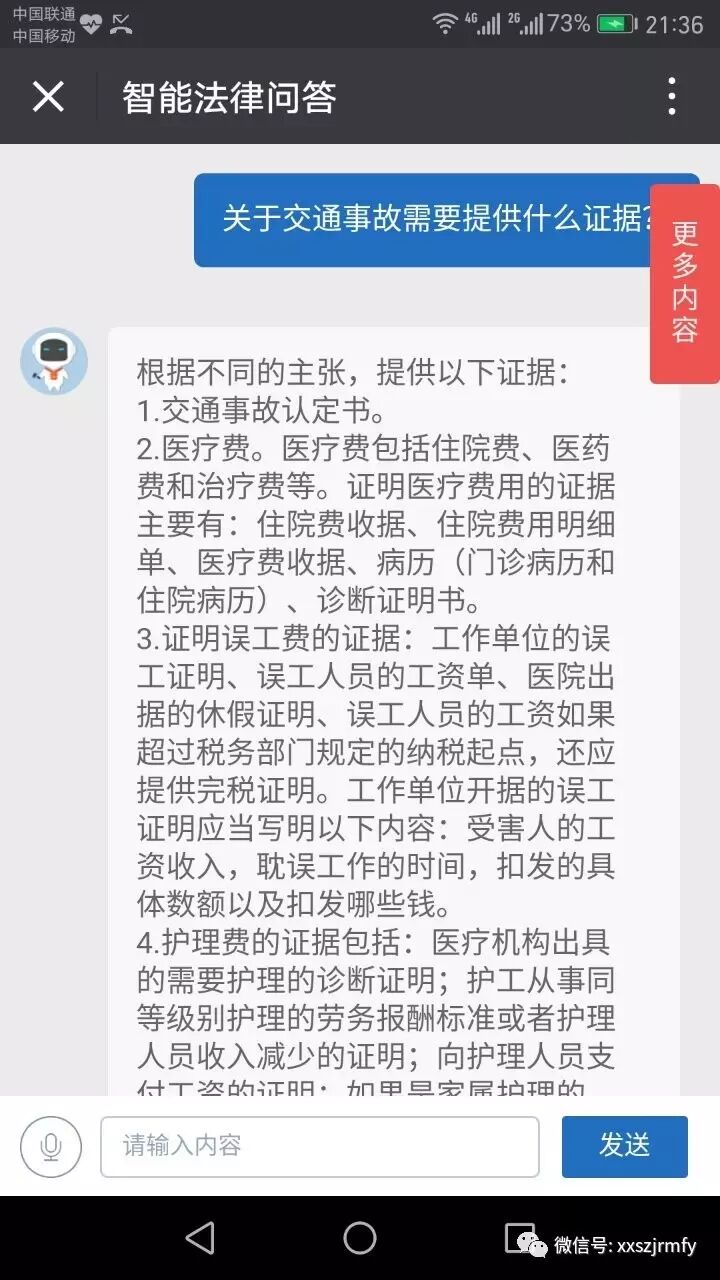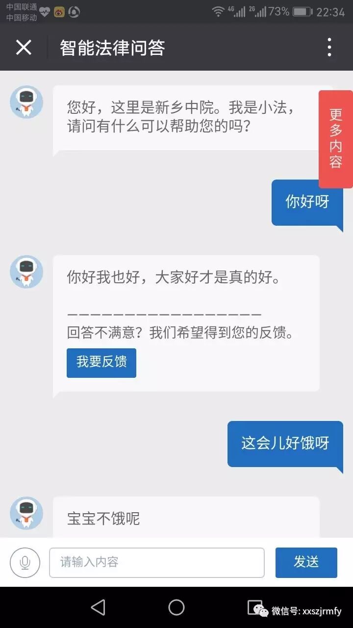 绝招一:法律问题 有问必答 有任何法律问题,直接通过语音或者文本输入关键词点击发送后,进入查询界面。根据自身需要选择相应项目查询即可。查询结果如图所示,一目了然。 PS:为了便于小法君识别问题,请输入关键词,关键词,关键词! 不要直接输入问题句子哟!也尽量不要一次输入多个关键词 ——毕竟,人家小法君只是个机器人嘛,太长的句子和信息会让它感到迷茫的~~~ 绝招二:类案要素指引 裁判预测参考 点击右上方“更多内容”,选择案由,并按提示填写要素式案件信息, 对于交通肇事、危险驾驶、盗窃、故意伤害、抢劫、抢夺等十余种常见罪名,以及离婚纠纷、劳动争议、民间借贷等常见民事案件,然后由小法君根据法律规定和司法判例,对裁判结果进行参考性的预判,也可以由当事人了解查询相似判例,让当事人在诉讼之前对裁判结果有一定的评估依据。 PS:司法案件都有一些独特的事实因素,所以,小法君的评估仅供参考,仅供参考、仅供参考哟! 绝招三:费用赔偿 轻松知晓 如上所述,点击右上角“更多内容”进入后,点击法律工具,然后选择费用计算器,按照要求填写基本信息,即可对诉讼费用、工伤赔偿、交通事故赔偿等常见费用和赔偿金额进行估算。 PS:如上所述,有关费用和赔偿,也是仅供参考、仅供参考、仅供参考!具体的费用和赔偿还要以法院实际裁判为准滴! 绝招四:百科天气 助手达人 作为一个爱学习的机器人,仅仅知道法律知识肯定是不够的。大到天文地理,中到时政人文、小到生活百科,再到娱乐新闻,贴心到天气贴士,小法都是样样门清呢。直接在对话框输入查询查询内容或者直接语音输入,就可以轻松了解更多信息啦。 绝招五:轻撩尬聊 唠嗑良伴 除了工作学习,小法君也是个爱唠嗑扯闲篇的话痨。虽然人类的语言仍在学习中,聊天思路经常跳跃的有点大,不过孤单寂寞的小伙伴儿反正也没人理,跟小法君轻轻松松聊会儿天,想来也是极好的呢。小法君作为爱岗敬业好陪聊,诚心欢迎各种调戏各种尬聊哟! 怎么样?这就是我们的新朋友法律学霸小法君啦! 所以,还等什么呢? 赶快关注新乡中院官方微信!小法君撩起来!